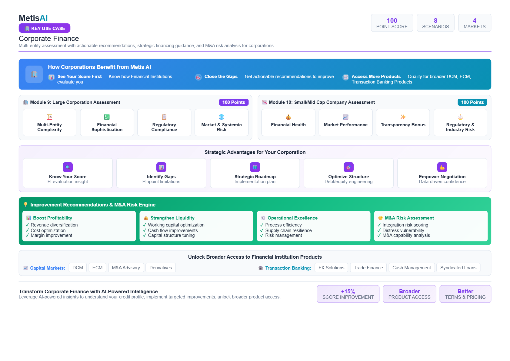 Multi-entity assessment with actionable recommendations and strategic financing guidance for corporations